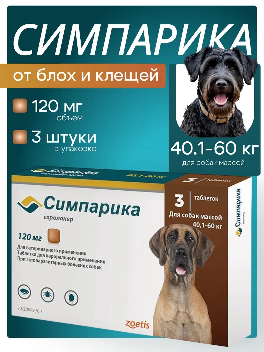 Zoetis Симпарика 120 мг 40-60 кг (3 таблетки) до 09.2025