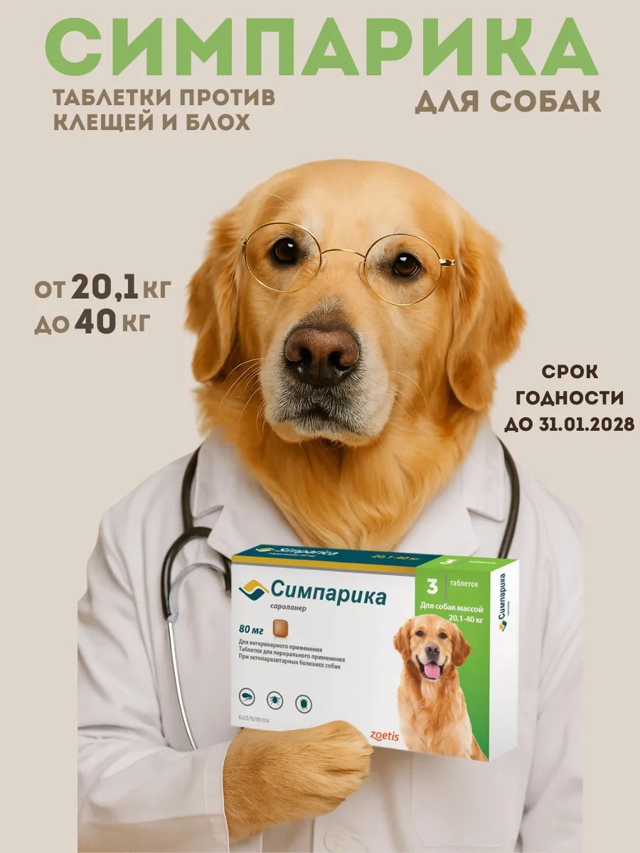 Симпарика 3 таблетки по 80мг на вес 20,1 -40 кг