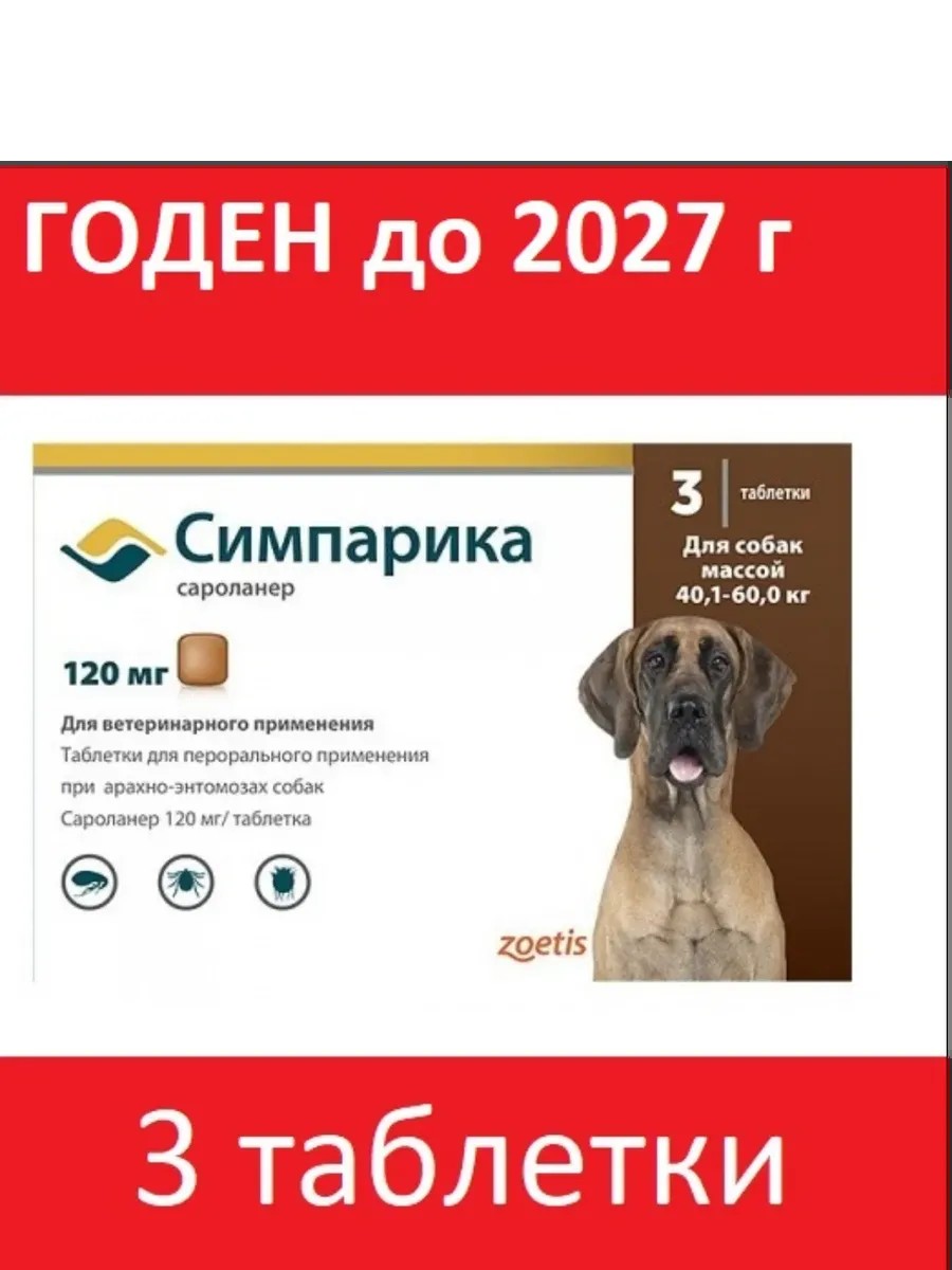Симпарика 40 60 кг для собак от клещей 3 таблетки