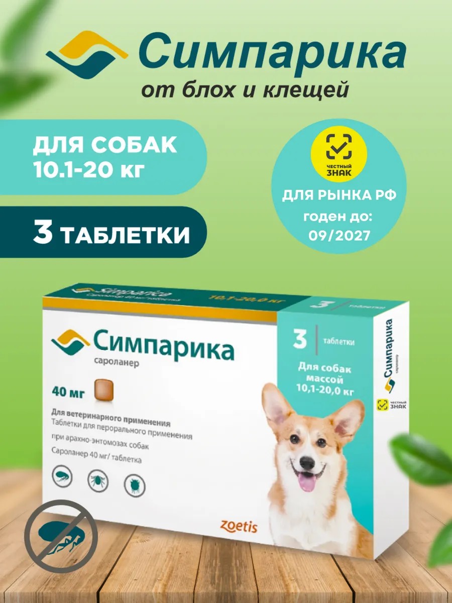 Zoetis Симпарика 40 мг, 10,1-20 кг, таблетки для собак, 3шт в уп