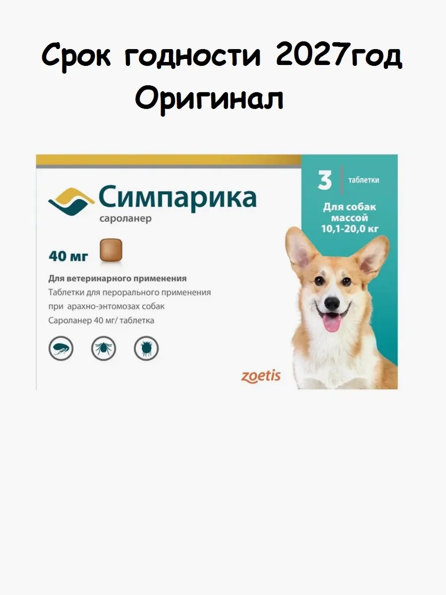 Zoetis Симпарика 40мг от блох и клещей для собак 10,1-20кг 3таблетк