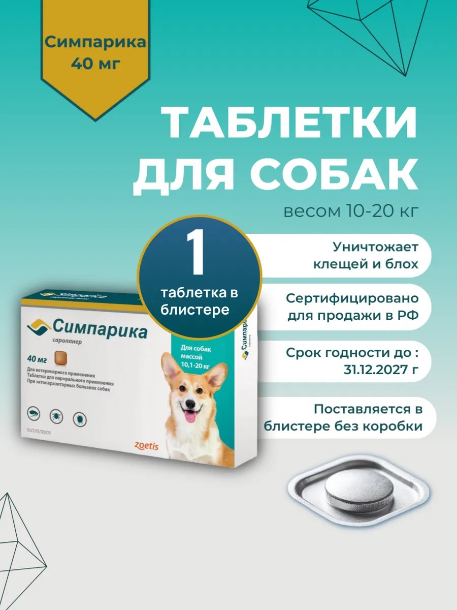 Симпарика 40 мг таблетки от блох и клещей для собак весом от 10 до 20 кг - 1 шт в блистере - это эффективное средство для защиты вашего питомца от паразитов. Этот препарат содержит активное вещество сароланер, которое помогает уничтожить блох и клещей на коже и шерсти собаки.