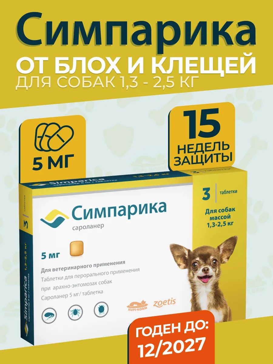 Zoetis Симпарика 5 мг (уп. 3 табл.) от 1,3 до 2,5 кг. СРОК 12.2027