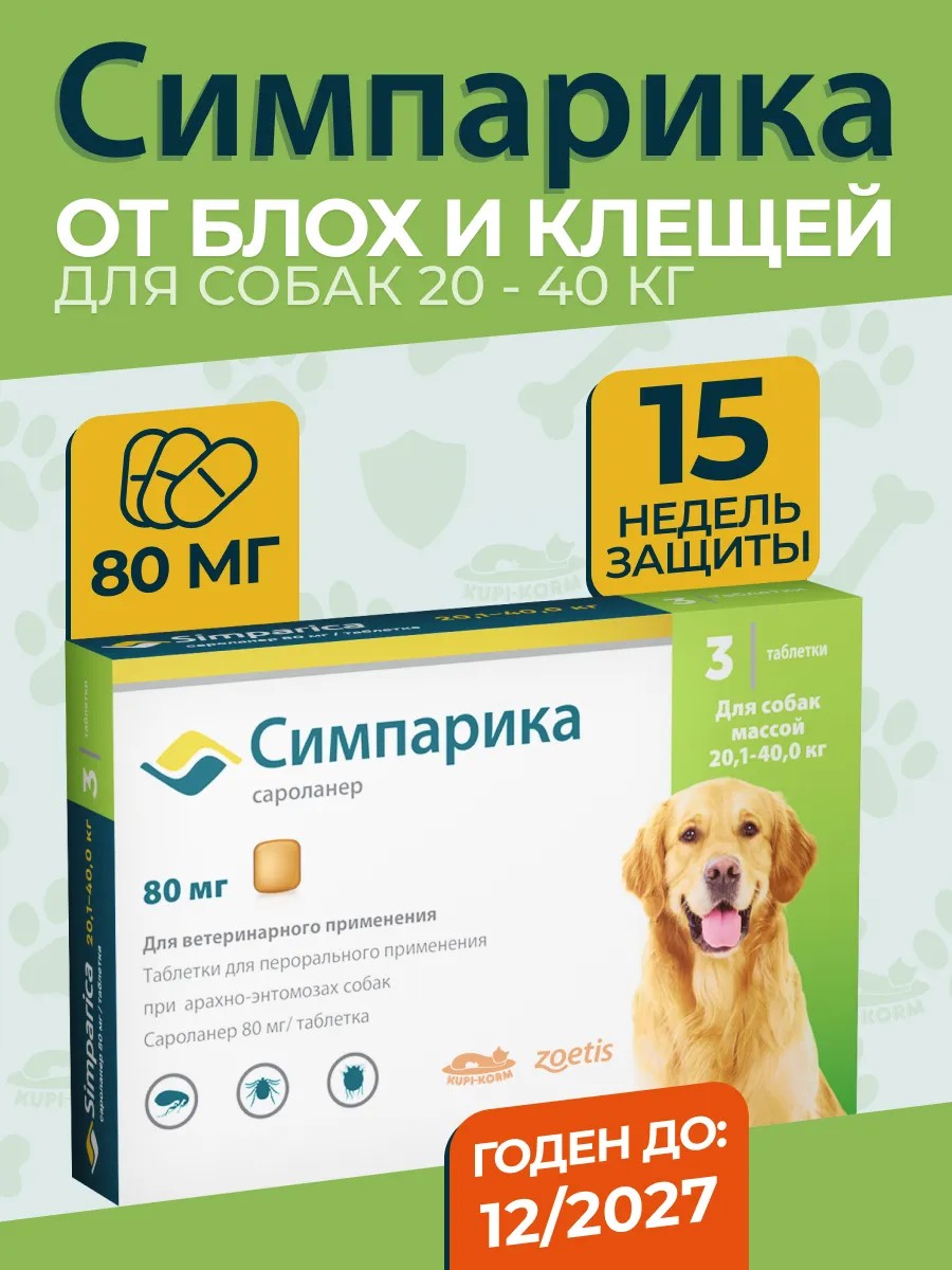!!!СРОК 12.2027!!! Жевательные таблетки Симпарика 80 мг для собак весом от 20,1 до 40 кг и возрастом от 8 недель.