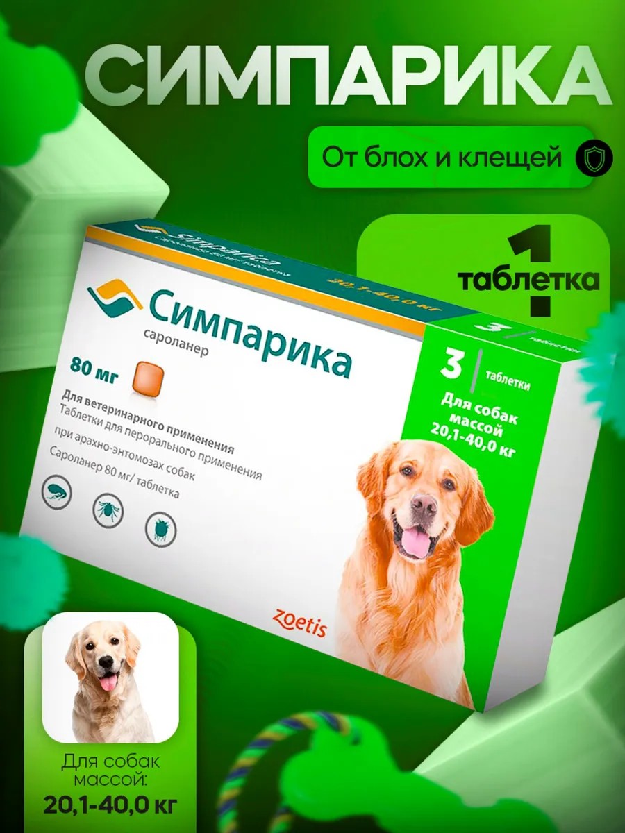 Симпарика 80мг,от клещей и блох для собак 20-40 кг ( 1 таб)