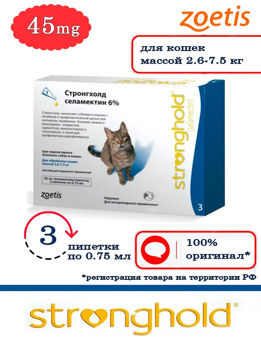Стронгхолд для кошек весом до 2,6-7,5 кг. 12% 0,75мл*3 пипетки, 45 мг