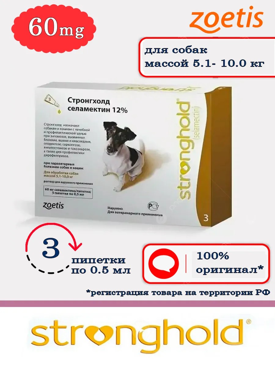 Капли Стронгхолд ZOETIS на холку от блох, клещей и гельминтов 12% 60 мг для собак массой от 5,1 до 10,0 кг, 3 пипетки х 0,5 мл