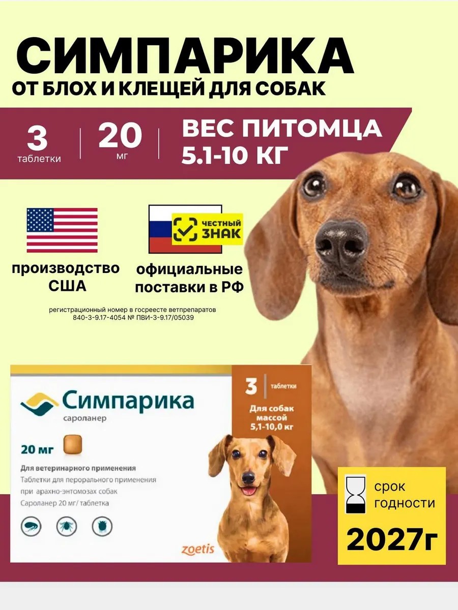 Симпарика, табл 20 мг (уп. 3 табл.) от 5-10 кг. Производство США для РФ. Срок годности до 2027г.