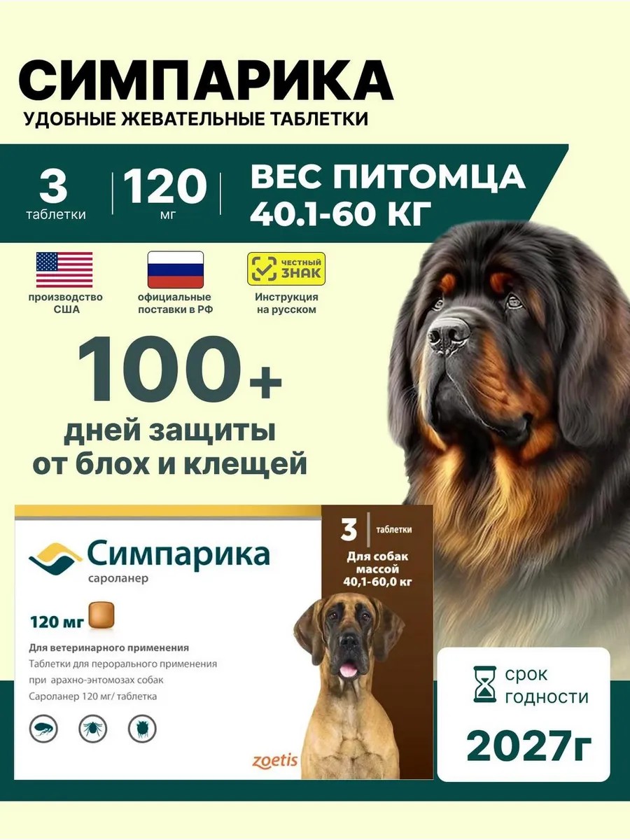 симпарика 120 мг против блох и клещей для собак весом от 40.1 до 60 кг 3 таблетки рекомендована для активных собак крупных пород: Ротвейлер (40–60 кг); Доберман (40–45 кг); Немецкий дог (45–60 кг); Бернский зенненхунд (40–55 кг); Ньюфаундленд (50–60 кг); Сенбернар (50–60 кг); Алабай (центральноазиатская овчарка, 40–60 кг); Кангал (45–60 кг); Мастиф (английский, 50–60 кг); Акита-ину (40–50 кг)