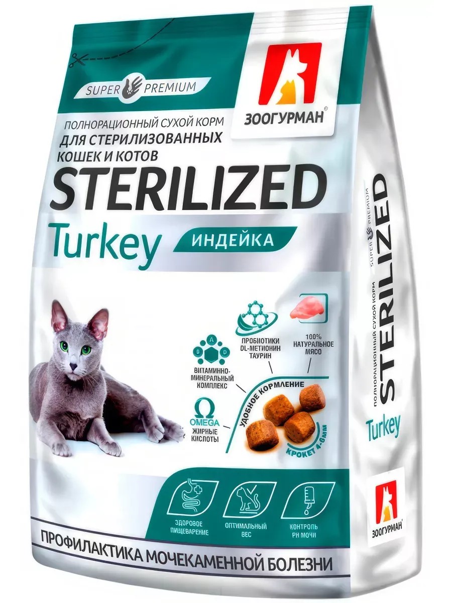 ZooGurman Sterilized Turkey food for sterilized cats, with turkey, 350 g. Zoogurman Sterilized Turkey food for sterilized cats, with turkey, 350 g. Zoogurman Sterilized Turkey food for sterilized cats, with turkey Prevention of urolithiasis, healthy digestion, optimal weight, urine pH control. Ingredients: dehydrated turkey meat, wheat, corn, rice, animal fats, vegetable fiber, hydrolyzed animal proteins, brewer's yeast, salmon oil, vitamin and mineral complex (vitamins: A, D3, E, B1, B2, B3, B4, B5, B6, B9 (folic acid), B12, H (biotin) and trace elements: iron, copper, zinc, manganese, iodine, selenium, potassium, magnesium, cobalt, sodium), probiotics, taurine, DL-methionine, L-cysteine, L-lysine, rose hips, yucca schidigera extract, antioxidants. Guaranteed indicators: Proteins 27.0% Fats 13.0% Fiber - 2.08% Ash - 5.38% Calcium - 1.10% Phosphorus - 0.84% Moisture 8.0% Omega-3 fatty acids - 0.70% Omega-6 fatty acids - 2.39% Vitamins and microelements in 1 kg. feed, not less than: A - 18,000 IU/kg, D3 - 1,400 IU/kg, E - 300 mg/kg, K - 0.1 mg/kg, B1 - 5.0 mg/kg, B2 - 4.5 mg/kg, B3 - 50.0 mg/kg, B4 2,000.0 mg/kg, B5 - 8.0 mg/kg, B6 - 8.0 mg/kg, B9 - 4.4 mg/kg, B12 0.25 mg/kg, H - 0.1 mg/kg, C - 150.0 mg/kg, Iron - 80.0 mg/kg, Copper - 10.0 mg/kg, Zinc - 100.0 mg/kg, Manganese - 9.0 mg/kg, Iodine - 1.5 mg/kg, Selenium - 0.25 mg/kg, Potassium - 0.1 mg/kg, Magnesium - 0.01 mg/kg, Cobalt - 0.05 mg/kg, Sodium - 0.4 mg/kg. Energy value: 387 kcal/100 g. Feeding recommendations: when switching from one dry food to another, do so gradually, in small portions over 5-7 days. The animal should always have access to fresh drinking water. cat's weight (kg) daily intake (g) 2-4 30-58 4-6 58-83 6-8 83-104 8-10 104-125
