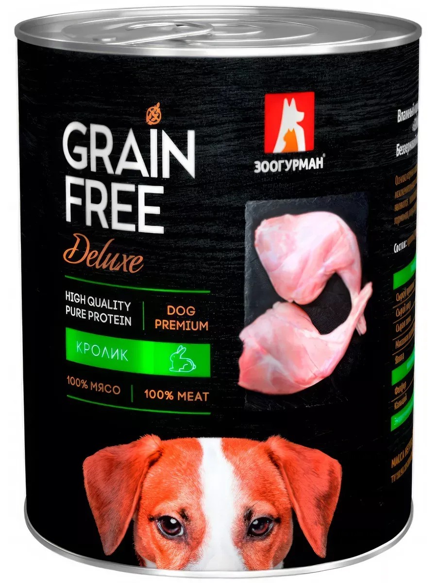 Корм Зоогурман Grain Free Deluxe (консерв.) для собак, беззерновой, кролик, 350 г 12 шт. Корм Зоогурман Grain Free Deluxe (консерв.) для собак, беззерновой, кролик, 350 г x 12 шт. Влажный корм для собак ЗООГУРМАН GRAIN FREE Deluxe. Беззерновой корм супер-премиум класса. - 100% натуральные ингредиенты - Беззерновой состав (GRAIN FREE) - Минимальный риск развития аллергии - Деликатный способ приготовления - Сохранены все питательные вещества - Необходимые витамины и минералы Основным ингредиентом и главным источником белка является высококачественное мясо Состав: кролик, желирующая добавка, соль, вода. Пищевая ценность в 100г продукта: сырой протеин - не менее 10,0г
