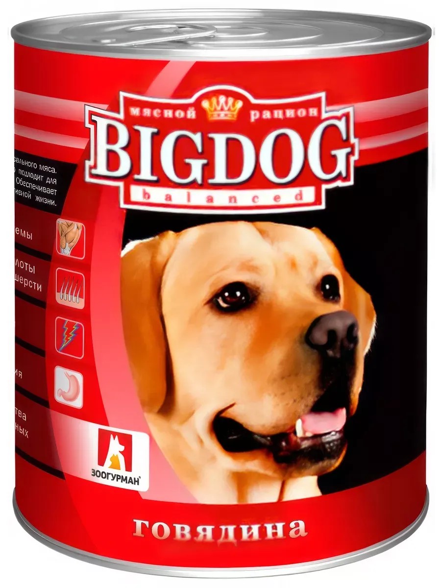 Корм Зоогурман Big Dog (консерв.) для собак, с говядиной, 850 г 6 шт. БИГДОГ (BIGDOG)- мясной корм для собак на основе натурального мяса. Состав серии оптимально сбалансирован, идеально подходит для ежедневного кормления и поддержания иммунитета. Обеспечивает питомца необходимым запасом энергии для активной жизни. Белки - для развития мышечной системы Ненасыщенные жирные кислоты - для здоровой кожи и блестящей шерсти Антиоксиданты - для укрепления иммунитета Клетчатка - для здорового пищеварения ГОВЯДИНА Состав: говядина, субпродукты мясные, натуральная желирующая добавка, злаки (не более 2%), соль, вода. Пищевая ценность в 100г продукта: протеин - 8,0г, жир - 7,0г, углеводы - 4,0г, клетчатка - 1,0г, зола 2,0г, влага - не более 80%. Энергетическая ценность: 111 ккал/100г. Срок годности: 3 года с даты изготовления при соблюдении условий хранения. Условия хранения: хранить при температуре от 0C до +25C и относительной влажности воздуха не более 75%. После вскрытия потребительской упаковки продукт хранить в холодильнике не более 2-х суток.