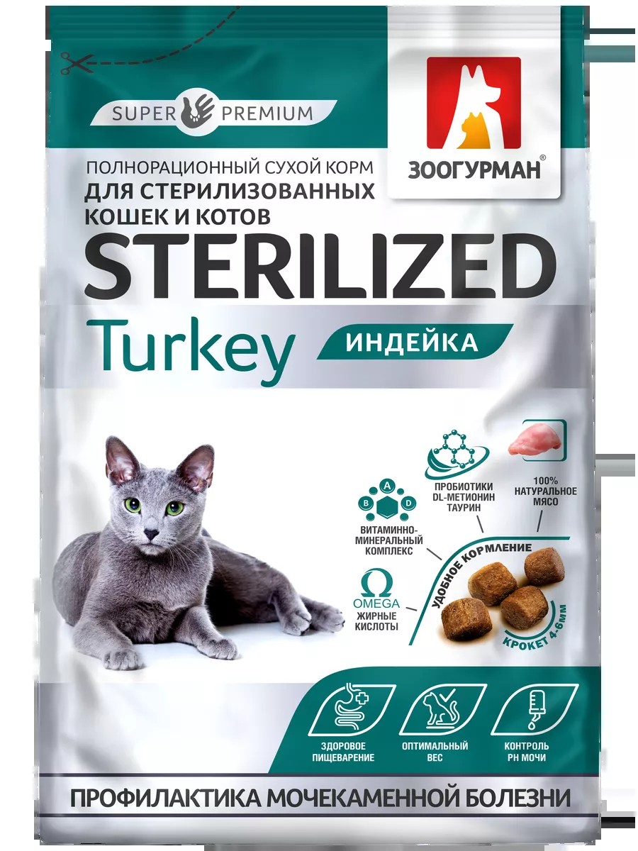 Полнорационный сухой корм для стерилизованных кошек и котов Zoogurman Sterilized, Индейка/Turkey Профилактика мочекаменной болезни- здоровое пищеварение- оптимальный вес- контроль PH мочи