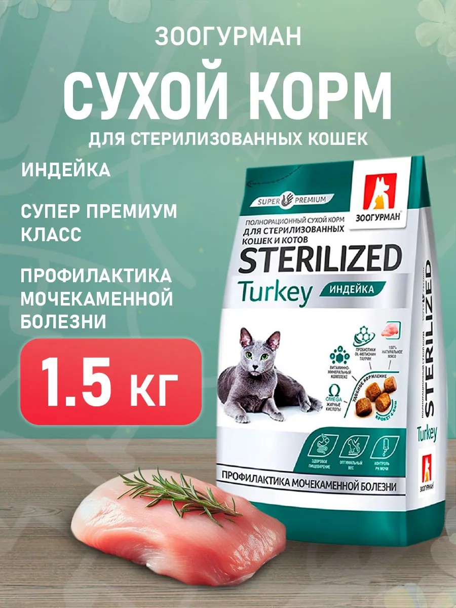 ЗООГУРМАН Корм Sterilized для стерилизованных кошек индейка 1,5кг