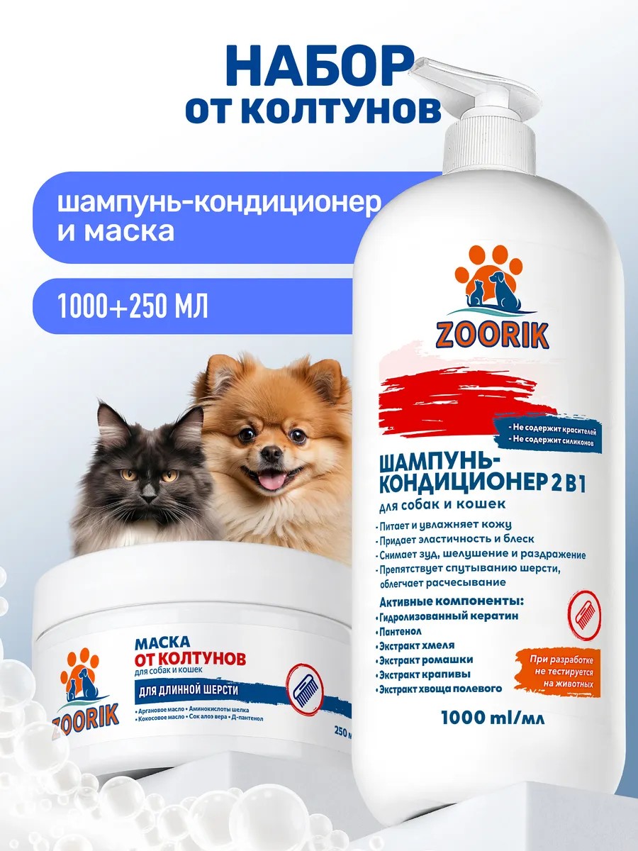 Профессиональный набор шампунь-кондиционер 1 литр 2 в 1 и маска от колтунов 250 мл для собак и кошек ZOORIK создан для полноценного ухода за шерстью и кожей животных. Уникальная формула объединяет функции глубокой очистки и кондиционирования, что делает его особенно удобным в применении. Такой уход подходит для длинношерстных, короткошерстных, гладкошерстных, включая собак и кошек для разных пород: лабрадоров, мопсов, чихуахуа, шпицев, йорков, такс, пуделей, корги, ши-тцу, той терьеров, французского бульдога, а также для кошек любых типов шерсти и длинношерстных мейн-кунов. Очищающий шампунь подходит для щенков и котят от 3х месяцев до года и взрослых животных. Экстракт ромашки деликатно ухаживает за кожей, снимает покраснения, устраняет зуд и дарит ощущение комфорта. Хвощ полевой насыщает витаминами и микроэлементами, укрепляет волосяные луковицы, делая шерсть плотной и блестящей. Крапива восстанавливает природный баланс кожи, регулирует работу сальных желез, предотвращает сухость и ломкость. Хмель стимулирует обменные процессы, придаёт объём и живой блеск. Гидролизованный кератин восстанавливает поврежденные участки шерсти изнутри, делая её гладкой и шелковистой. Шампунь с пантенолом активно питает и увлажняет, укрепляет и придаёт мягкость. Снимает зуд, шелушение и раздражение. Благодаря сочетанию натуральных экстрактов и кондиционирующих компонентов шерсть легко расчёсывается, меньше спутывается, выглядит ухоженной и здоровой. Зоошампунь собачий и кошачий гипоаллергенный помогает восстановить структуру волоса, улучшает внешний вид и общее состояние шерсти питомца. После применения шерсть становится мягкой, эластичной, сияющей и послушной, а питомец выглядит ухоженным и аккуратным. Шампунь для собак идеален как для домашнего ухода, так и для применения в салоне.