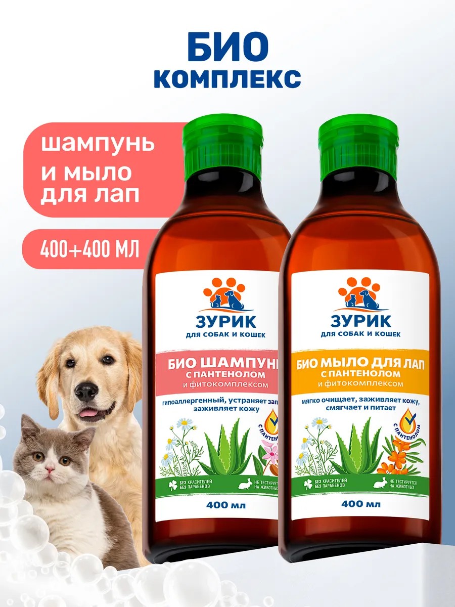 Профессиональный набор грумера био шампунь и мыло для лап собак и кошек ZOORIK с пантенолом и фитокомплексом 400 мл обеспечивает деликатное очищение, удаляет загрязнения и устраняет неприятные запахи, сохраняя естественный баланс кожи. Такой уход подходит для мелких и крупных пород животных: лабрадоров, мопсов, чихуахуа, шпицев, йорков, такс, пуделей, корги, ши-тцу, той терьеров, чихуахуа, французкого бульдога, а также для кошек любых типов шерсти, включая сфинксов и длинношерстных мейн-кунов. Очищающий шампунь подходит для щенков и котят от 3х месяцев до года и взрослых животных. Пантенол глубоко увлажняет, ускоряет заживление мелких повреждений, снимает зуд и покраснения, возвращая комфорт. Сок алоэ вера насыщает влагой, поддерживает регенерацию и дарит мягкость. Миндальное масло питает, создавая невесомый защитный барьер без утяжеления, делает шерсть шелковистой и ухоженной. Экстракт ромашки оказывает успокаивающее действие, помогает восстановить раздражённые участки и ускоряет регенерацию. Гидролизованный кератин укрепляет структуру шерсти, придает прочность, эластичность и блеск. Растительный увлажняющий компонент удерживает влагу, предотвращая сухость. Кондиционирующий комплекс облегчает расчесывание, снижает спутывание и делает шерсть гладкой и послушной. Зоошампунь собачий и кошачий помогает питомцам с чувствительной кожей избежать раздражений, сохранить ухоженный внешний вид и ощущение комфорта. Результат — ухоженный внешний вид, сияющий блеск и здоровая кожа без дискомфорта. Шампунь для собак гипоаллергенный для мелких пород идеален как для домашнего ухода, так и для применения в салоне.