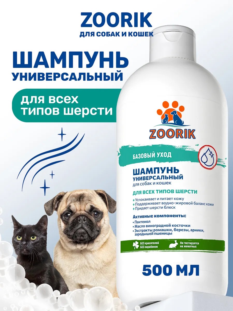 Профессиональный универсальный шампунь для собак и кошек ZOORIK 500 мл разработан для бережного ухода за шерстью и кожей животных. Такой уход подходит для длинношерстных, короткошерстных, гладкошерстных, включая собак и кошек для разных пород: лабрадоров, мопсов, чихуахуа, шпицев, йорков, такс, пуделей, корги, ши-тцу, той терьеров, французского бульдога, а также для кошек любых типов шерсти и длинношерстных мейн-кунов. Очищающий шампунь подходит для щенков и котят от 3х месяцев до года и взрослых животных. Сбалансированный состав мягко очищает, удаляет загрязнения и неприятные запахи, одновременно заботясь о здоровье кожи. Масло виноградной косточки придает шерсти мягкость и шелковистость, облегчает расчесывание и наполняет естественным блеском. Пантенол укрепляет структуру волосков, снимает раздражения и защищает от сухости.
