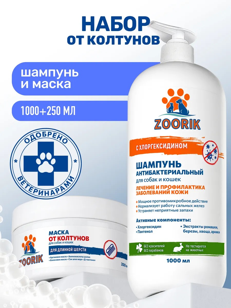 Профессиональный набор шампунь 1 литр и маска для длинной шерсти от колтунов 250 мл для собак и кошек ZOORIK антибактериальные создан для бережного ухода за животными с чувствительной кожей, склонной к воспалениям и раздражениям. Шампунь с хлоргексидином для собак 5% лечебный на основе растительного увлажняющего компонента помогает не только тщательно очищать шерсть, но и устранять бактерии, предупреждая повторное появление воспалительных процессов. Такой уход подходит для длинношерстных, короткошерстных, гладкошерстных и бесшерстных, включая собак и кошек для разных пород: лабрадоров, мопсов, чихуахуа, шпицев, йорков, такс, пуделей, корги, ши-тцу, той терьеров, французского бульдога, а также для кошек любых типов шерсти, включая сфинксов и длинношерстных мейн-кунов. Экстракт ромашки смягчает и снимает раздражения, обеспечивая комфорт даже при регулярном применении. Экстракт березы укрепляет луковицы, способствует росту здоровой шерсти и улучшает состояние кожи. Экстракт арники ускоряет восстановление при мелких повреждениях, а экстракт хвоща обогащает кожу микроэлементами, укрепляя структуру волоса. Пантенол глубоко питает и увлажняет, помогая устранить сухость и зуд. Очищающий шампунь подходит для щенков и котят от 3х месяцев до года и взрослых животных, обеспечивает профилактику бактериальных инфекций, поддерживает оптимальный баланс кожи и делает шерсть питомца густой, блестящей и ухоженной.