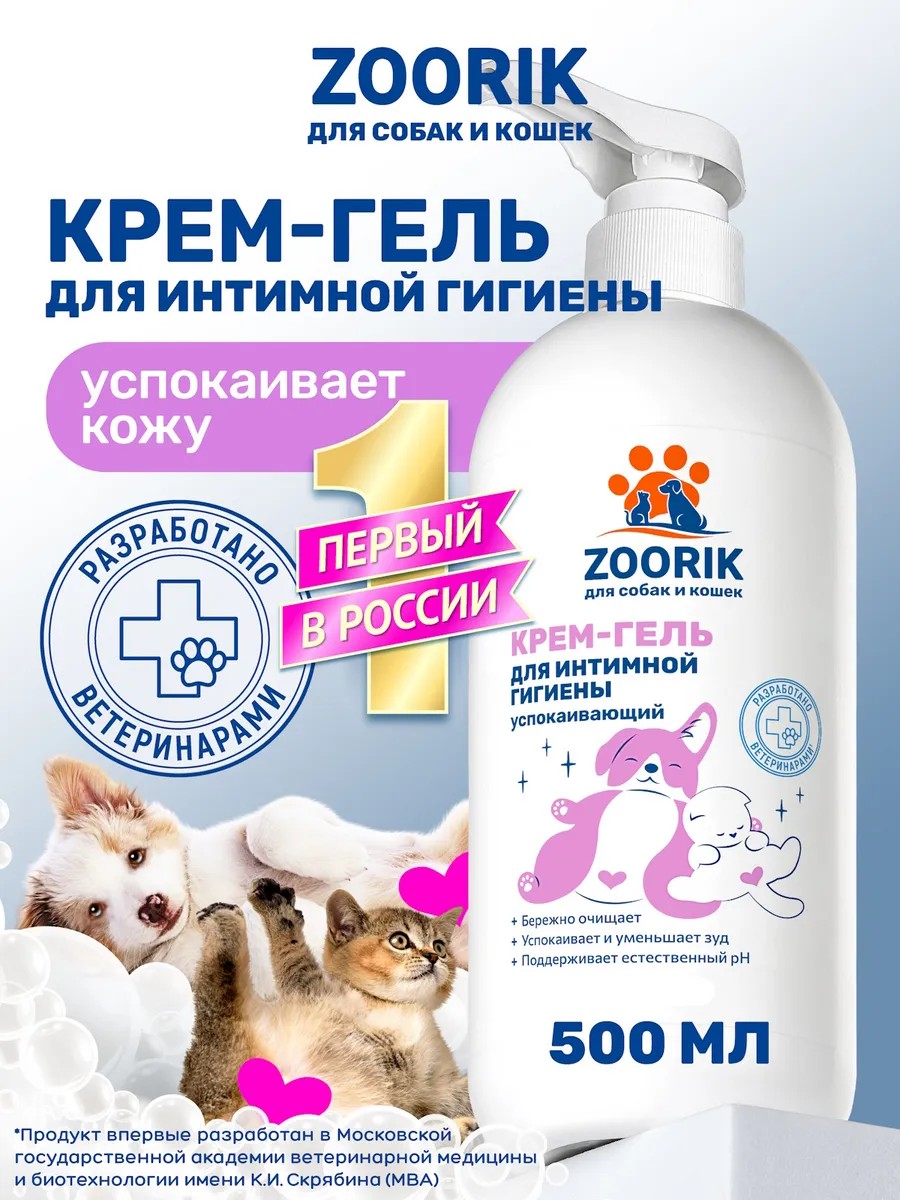 Профессиональный крем-гель для собак и кошек 500 мл ZOORIK успокаивающий для интимной гигиены создан специально для ежедневного ухода за деликатными зонами питомцев. Ветеринарный гигиентический шампунь обеспечивает бережное очищение и полноценный уход, сохраняя здоровье кожи и комфорт животного. Такой уход подходит для мелких и крупных пород животных, включая тех, кто склонен к раздражениям и дискомфорту: лабрадоров, мопсов, чихуахуа, шпицев, йорков, такс, пуделей, корги, ши-тцу, той терьеров, чихуахуа, французкого бульдога, а также для кошек любых типов шерсти, включая сфинксов и длинношерстных мейн-кунов. Очищающий шампунь подходит для щенков и котят от 3х месяцев до года и взрослых животных. Комплекс из экстрактов солодки, календулы и ромашки оказывает выраженное успокаивающее и противовоспалительное действие. Эти компоненты помогают снять раздражение, устранить зуд и чувство жжения, а также ускоряют восстановление кожи. Молочная кислота поддерживает естественный баланс pH, способствует сохранению микрофлоры и дарит ощущение свежести. Аллантоин смягчает, ускоряет процессы заживления и делает кожу более эластичной. Дополнительные увлажняющие компоненты сохраняют влагу, предотвращая сухость и дискомфорт. Подмывалка от запаха сохраняет чувство чистоты на длительное время. Средство для интимной гигиены собак можно использовать ежедневно, так как он дружественен к естественному микробиому и не вызывает раздражений. Его нежная текстура легко распределяется, не пересушивает кожу и делает уход максимально деликатным. Результат — питомец получает комфорт, свежесть, защиту, здоровье и чистоту каждый день.