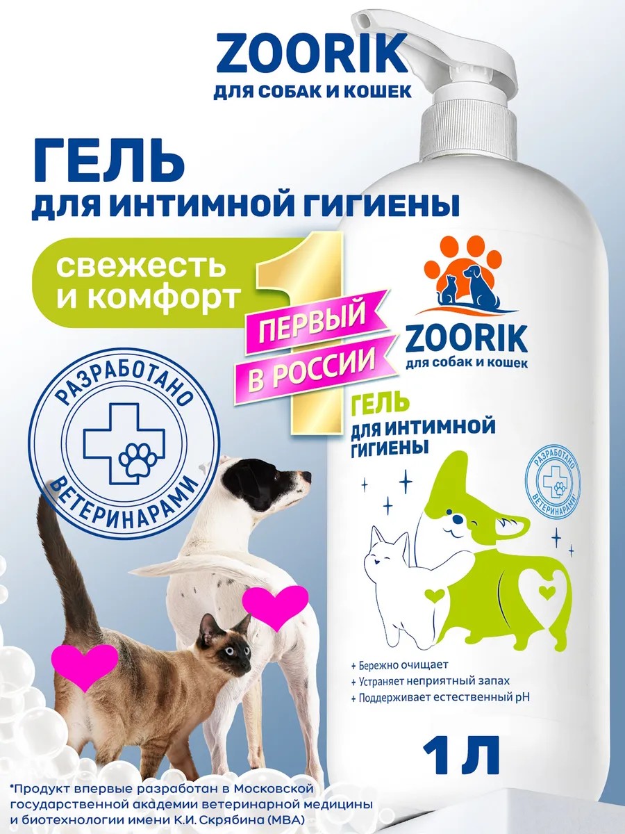 Профессиональный шампунь гель для собак и кошек 1 литр ZOORIK для интимной гигиены создан для бережного ухода за особо чувствительными зонами животных. Крем гель с пантенолом обеспечивает мягкое очищение и деликатную защиту, поддерживая здоровье кожи и естественный баланс микрофлоры. Такой уход подходит для мелких и крупных пород животных, включая тех, кто склонен к раздражениям и дискомфорту: лабрадоров, мопсов, чихуахуа, шпицев, йорков, такс, пуделей, корги, ши-тцу, той терьеров, чихуахуа, французкого бульдога, а также для кошек любых типов шерсти, включая сфинксов и длинношерстных мейн-кунов. Очищающий шампунь подходит для щенков и котят от 3х месяцев до года и взрослых животных. Формула обогащена пантенолом, который снимает покраснения, способствует заживлению и укрепляет кожу. Сок алоэ вера глубоко увлажняет, смягчает и придает ощущение свежести. Экстракт корня солодки оказывает выраженное успокаивающее и противовоспалительное действие, помогая предотвратить появление неприятных ощущений. Молочная кислота поддерживает оптимальный кислотно-щелочной баланс, обеспечивая защиту и комфорт даже при ежедневном использовании. Аллантоин усиливает регенерацию, предотвращает сухость и делает кожу более эластичной. Подмывалка от запаха оставляет ощущение чистоты и свежести. Средство для интимной гигиены собак можно использовать регулярно, не вызывает дискомфорта. Регулярный уход помогает снизить риск воспалений, поддерживает здоровье интимной зоны и дарит питомцу максимальный комфорт. Результат — ухоженная и защищённая кожа, отсутствие раздражений и полное ощущение чистоты и свежести каждый день.