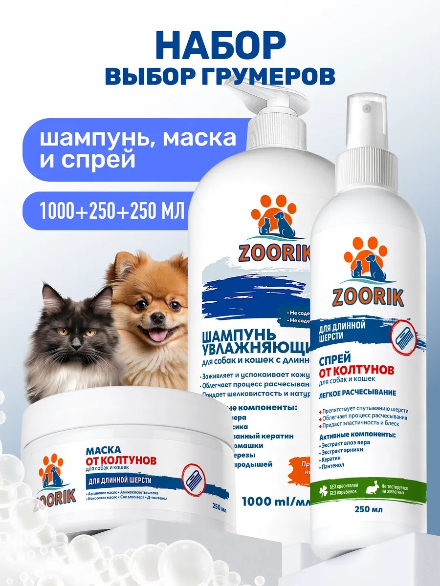 Профессиональный набор шампунь для длинной шерсти собак и кошек 1 литр, маска и спрей от колтунов 250 мл ZOORIK создан для животных с густой и склонной к спутыванию шерстью. Очищающий шампунь для щенков и котят от 3х месяцев до года и взрослых животных направлен на глубокое питание и восстановление. Зоошампунь подходит для мелких, средних и больших пород: йорков, шпицев, мальтипу, пудель, корги, ши-тцу, чихуахуа, той терьера, таксы, мопсов, самоедов, лабрадоров, а также для кошек длинношерстных мейн-кунов. В основе состава увлажняющего гипоаллергенного шампуня гидролизованный кератин, который укрепляет волос по всей длине, возвращает ему эластичность и блеск, облегчает расчесывание и снижает риск образования колтунов. Сок алоэ вера насыщает влагой, предотвращает пересыхание и поддерживает защитный барьер кожи, оберегая питомца от раздражений. Экстракт ромашки оказывает мягкое успокаивающее действие, снимает покраснения и делает шерсть гладкой и шелковистой. Экстракт березовой коры укрепляет корни, придает упругость и здоровый вид. Масло персика деликатно питает, улучшает текстуру, придаёт мягкость и сияние. Экстракт зародышей пшеницы предотвращает ломкость и выпадение, возвращая шерсти плотность и силу. Пантенол усиливает защитные функции кожи, устраняет сухость и делает шерсть послушной. Шампунь кошачий и собачий увлажняет, делая здоровую и шелковистую шерсть без колтунов, идеален как для домашнего ухода, так и для применения в салоне.