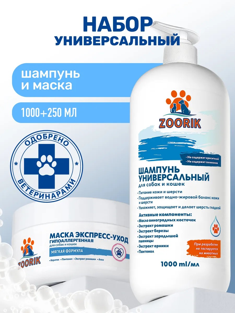 Профессиональный универсальный набор шампунь 1 литр и маска для шерсти собак и кошек ZOORIK разработан для бережного ухода за шерстью и кожей животных. Такой уход подходит для длинношерстных, короткошерстных, гладкошерстных, включая собак и кошек для разных пород: лабрадоров, мопсов, чихуахуа, шпицев, йорков, такс, пуделей, корги, ши-тцу, той терьеров, французского бульдога, а также для кошек любых типов шерсти и длинношерстных мейн-кунов. Очищающий шампунь подходит для щенков и котят от 3х месяцев до года и взрослых животных. Сбалансированный состав мягко очищает, удаляет загрязнения и неприятные запахи, одновременно заботясь о здоровье кожи. Масло виноградной косточки придает шерсти мягкость и шелковистость, облегчает расчесывание и наполняет естественным блеском. Пантенол укрепляет структуру волосков, снимает раздражения и защищает от сухости. Экстракт ромашки обладает успокаивающим и дезодорирующим действием, дарит ощущение свежести, смягчает и ухаживает за чувствительной кожей. Экстракт березы освежает, регулирует выделение жира и помогает предотвратить появление зуда. Экстракт зародышей пшеницы питает и восстанавливает, улучшает текстуру шерсти, делая её более послушной. Экстракт арники насыщает витаминами и антиоксидантами, укрепляет естественные защитные функции кожи. Бетаин глубоко увлажняет, сохраняя влагу внутри, что предотвращает ломкость и сухость. Зоошампунь собачий и кошачий для ежедневного применения мытья лап, делает шерсть питомца ухоженной, сияющей и мягкой на ощупь, а кожа получает надежную защиту и комфорт. В результате ваш любимец выглядит здоровым, ухоженным и наполненным энергией. Шампунь для собак гипоаллергенный для мелких пород идеален как для домашнего ухода, так и для применения в салоне.
