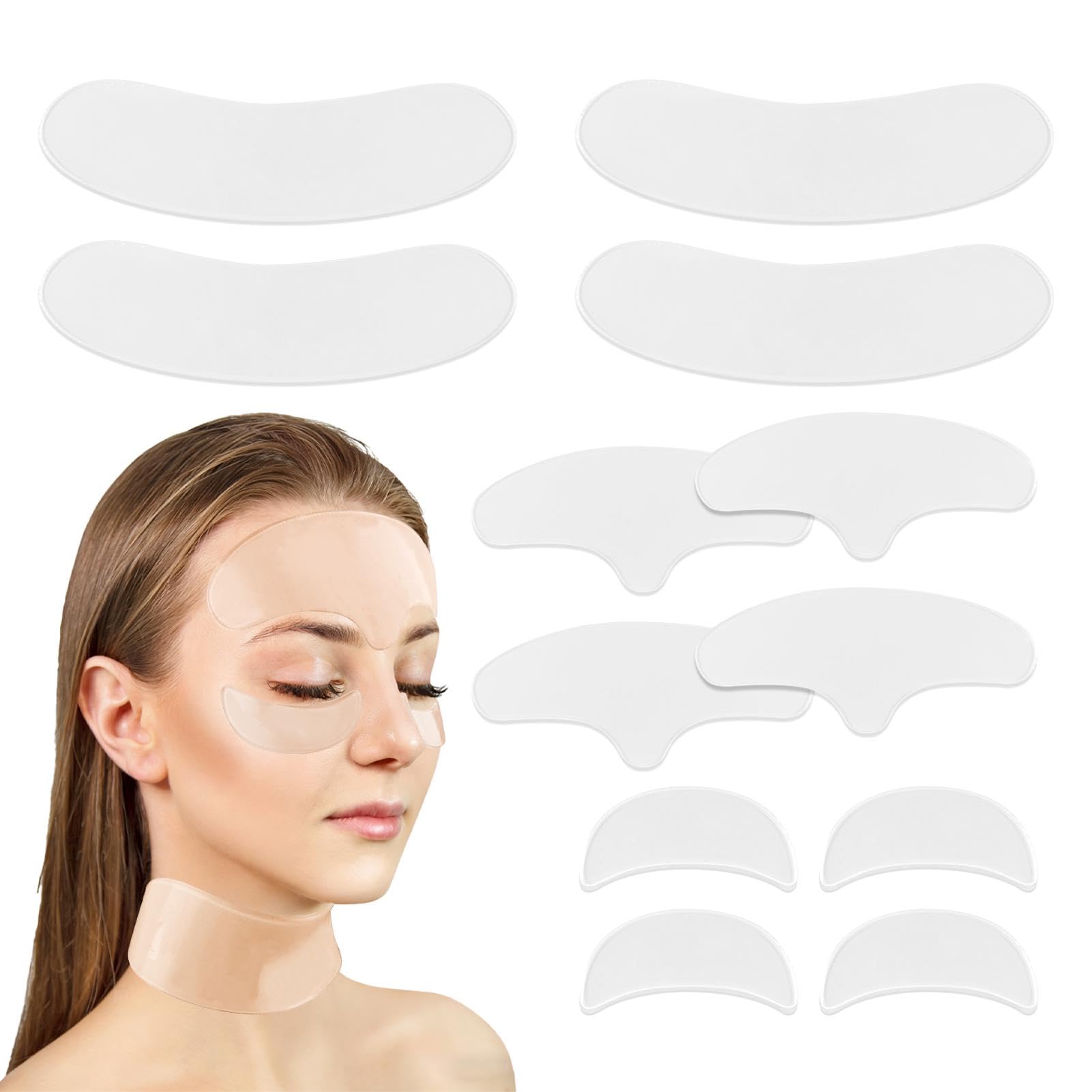 12-piece set: 4 pieces of forehead anti-wrinkle patches 4 pieces of neck anti-wrinkle patches 4 pieces of eye anti-wrinkle patches. It precisely targets and smooths out forehead lines, frown lines (cross-shaped lines) and neck wrinkles, effectively reducing dynamic wrinkles. Daily use can not only repair existing wrinkles but also actively prevent the formation of fine lines. This set simultaneously tightens the skin on the forehead, eyes and neck, meeting your anti-wrinkle needs in these three areas. Deep moisturizing and firming the skin: The neck stretch silicone patch has a powerful moisturizing effect, which can enhance the skin's water retention capacity, increase elasticity, reduce sagging, and restore the skin's youthful vitality. Reusable - Each neck wrinkle patch can be reused up to 15 times, providing you with an economical solution to help you maintain smooth and youthful skin for a long time. Super adhesiveness: The silicone anti-wrinkle patch has its own adhesiveness, adheres tightly and is not easy to fall off, while gently caring for every inch of the skin. Even when used at night, it can adhere firmly without frequent adjustments. Made of breathable silicone material, it will not accumulate sweat or clog pores, and will not cause redness, swelling or stinging even after long-term wearing. Product material: Silicone Product dimensions: Neck patch: 19 6cm, Forehead patch: 14.5 5cm, Eye patch: 7 3.3cm The set includes: 4 neck patches, 4 forehead patches and 4 eye patchesThis set includes 4 forehead wrinkle patches, 4 neck pads, and 4 eyes silicone patches, designed for women seeking smoother-looking skin. They help soften the appearance of fine lines on multiple areas for a fresher, more relaxed look. To use, gently cleanse the forehead, neck, and chest, ensuring the skin is completely dry and free from lotions or oils. Stretch the skin slightly, place the silicone patches firmly on the target area, and let them sit for the desired time. After use, peel off slowly, rinse the pads with mild soap, allow them to air-dry, and store them properly so they remain reusable for multiple anti-wrinkle sessions. The Neck Wrinkle Patches Set is made from good-quality, skin-friendly silicone, these anti-wrinkle patches are gentle, comfortable, and suitable for sensitive skin. The soft texture adheres securely without irritation, providing an easy and non-invasive option for overnight use. Each silicone patch is reusable and washable, simply rinse with water after use and air dry to restore stickiness.This makes them environmentally-friendly, cost-effective, and suitable for long-term wrinkle reduction. Designed for neck lines,forehead lines and eyes lines, these silicone wrinkle patches include multiple facial pads to fit different areas.Use them as face wrinkle patches, neck pads or chest pads to help improve the look of fine lines while you relax or sleep.
