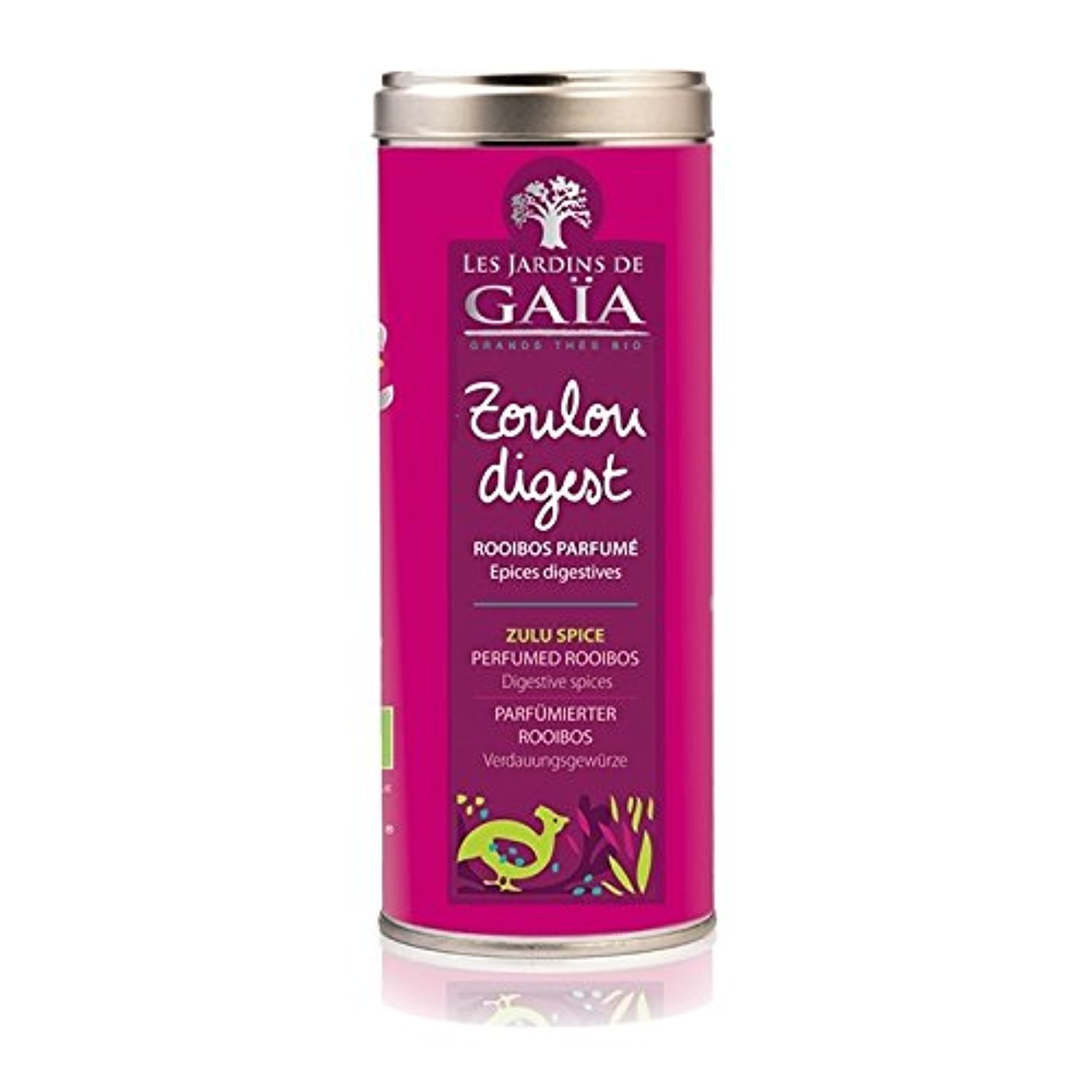 Zulu Digest - Organic Flavored Rooibos (Digestive Spices)Product type: TEA. Rooibos Licorice Spice Loose Leaf Tea, Les Jardins de Gaia, Organic Fairtrade, 100 grams net weight, Metal tin.Zoulou Digest - Rooibos Bio Aromatisé (Épices Digestives)Type de produit : TEA. Thé en vrac Rooibos Réglisse Épices, Les Jardins de Gaia, Bio Fairtrade, 100 grammes de poids net, Boîte en métal.Zoulou Digest - Rooibos parfumé (Epices digestives) bio
