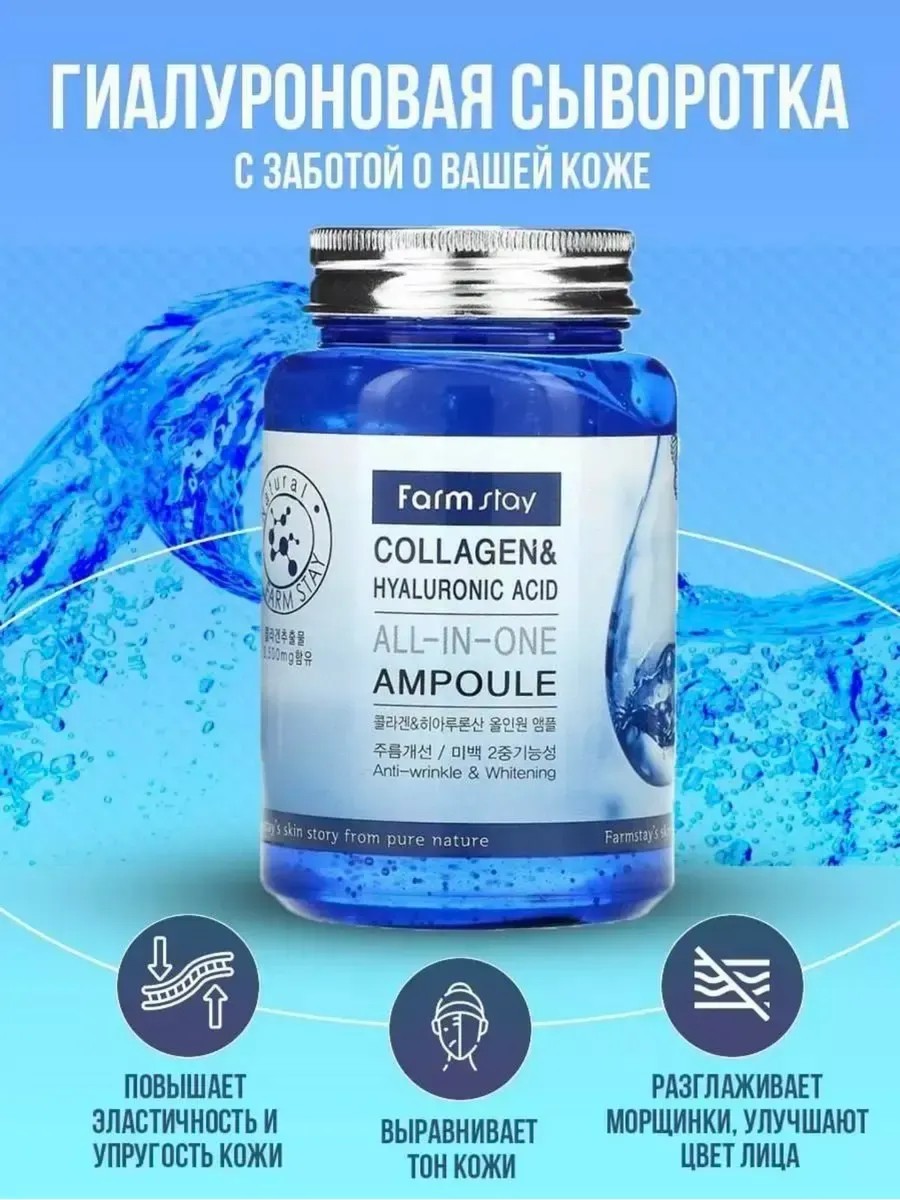 Сыворотка для лица FARMSTAY с Коллагеном АНТИВОЗРАСТНАЯ Корейская косметика против морщин. Сыворотка для лица известного корейского бренда Farm Stay Collagen & Hyaluronic Acid All-In-One Ampoule является прекрасным антивозрастным средством для ухода и увлажнения кожи лица, шеи и зоны декольте. Она обладает приятным цветочно-морским ароматом, представляя собой прозрачный, желеобразный гель с вкраплениями маленьких белых ампул.В ее состав входит гиалуроновая кислота, способствующая стимуляции обменных процессов, восстанавливая клетки кожи, тем самым оказывая мощный омолаживающий эффект. Морской коллаген служит для разглаживания морщинок, обеспечивая коже упругость и эластичность. Наличие витаминных микрогранул делает кожу сияющей и здоровой. Осветляющий эффект оказывает ниацинамид, борясь с пигментацией. Также в сыворотке присутствует аденозин, обладающий противовоспалительными свойствами.Корейская косметика очень хорошо зарекомендовала себя на мировом рынке, а гиалуроновая сыворотка FarmStay заслуженно является лидером продаж последние несколько лет.