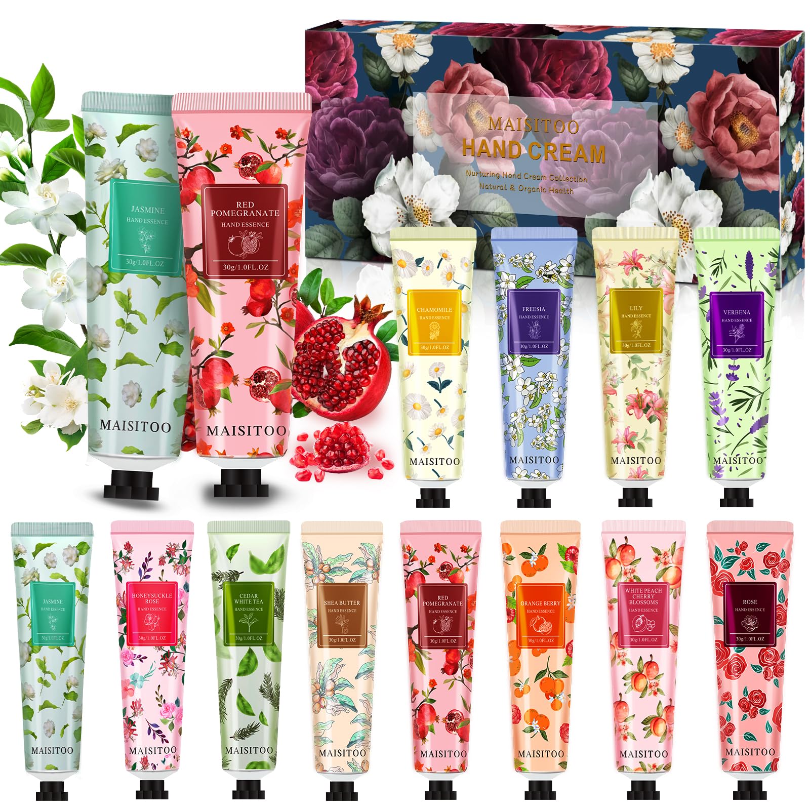 Perfect Gift: The exquisite and unique packaging design of this hand cream kit makes it a perfect gift for birthdays, Valentine's Day, anniversaries, Thanksgiving, Mother's Day, or Christmas. It moisturizes the skin, absorbs effectively, and leaves an enchanting fragrance. Surprise and delight your loved one, family, or friends. Easy to Carry: The mini hand cream is also lightweight and easy to carry and store. It's small and handy, easily fitting into your purse, shoulder bag, backpack, suitcase, etc., and can be used anytime, anywhere. Protect and moisturize your hands whenever you need to. Each fragrance is like a little gift for your senses and transforms hand care into a truly fragrant experience. Moisturizing and Nourishing: All our hand creams are made with a variety of botanical fragrances and fruit extracts, suitable for all skin types. Deeply nourish and replenish your hands, leaving them soft, smooth, and rejuvenated. Plant extracts deeply nourish the skin and give your hands a fresh, natural scent. This cream can be used as both a hand and body cream and is suitable for women, men, and children. For all skin types: Made with purely natural plant extracts, this non-greasy hand cream absorbs quickly and provides lasting protection. Particularly suitable for dry, dehydrated, and chapped skin, it is also suitable for arms, elbows, feet, and other parts of the body. By promoting natural skin regeneration, your skin will become softer and smoother than before. The hand cream has a soothing effect on the skin and can be used safely on irritated skin. 12 fragrances: Our hand cream set contains 12 different herbal and fruit scents. Including rose, chamomile, shea butter, freesia, orange wild berries, lily, peach sakura, cedar white tea, jasmine, honeysuckle rose, verbena, and pomegranate. Every day, you can choose your favorite scent from our hand cream to suit your mood.ZQEJEFD Lot de 12 mini crèmes pour les mains pour femme, coffret cadeau, crème pour les mains sèches, gercées, crème pour les mains, coffret cadeau pour femmes, hommes, maman, Noël, anniversairesCadeau parfait : le design de l'emballage de ce kit de crème pour les mains est exquis et unique, ce qui en fait un cadeau parfait pour les anniversaires, la Saint-Valentin, les anniversaires, Thanksgiving, la fête des mères ou Noël. Hydrate la peau des mains, pénètre efficacement dans la peau et dégage un parfum enchanteur. Surprenez et ravivez votre amoureux, votre famille ou vos amis. Facile à transporter : la mini crème pour les mains est également légère et facile à transporter et à ranger. Elle est petite et maniable, se glisse facilement dans votre sac à main, sacs à bandoulière, sacs à dos, valises, etc. et peut être utilisée à tout moment et n'importe où. Protégez nos mains et humidifiez nos mains à tout moment. Chaque parfum est comme un petit cadeau pour vos sens et transforme le soin des mains en une fête vraiment parfumée. Hydratant et nourrissant : toutes nos crèmes pour les mains sont composées d'une variété de parfums végétaux et d'extraits de fruits, adaptés à tous les types de peau. nourrir et remplir en profondeur, de sorte que vos mains restent douces, lisses et rajeunis. Les extraits de plantes peuvent nourrir la peau en profondeur et donner à vos mains un parfum frais et naturel. La crème peut être utilisée aussi bien comme crème pour les mains que comme crème pour le corps et convient aux femmes, aux hommes et aux enfants. Pour tous les types de peau : extraits de plantes purement naturels, non gras, la crème pour les mains pénètre rapidement et durablement. Particulièrement adapté pour les peaux sèches, déshydratées et gercées, convient également aux bras, coudes, pieds et autres parties du corps. En favorisant la régénération naturelle de la peau, la peau peut devenir plus douce et plus lisse qu'auparavant. La crème pour les mains a un effet apaisant sur la peau et peut être utilisée sans problème sur les peaux irritées. 12 types de parfums : notre kit de crème pour les mains contient 12 variétés de saveurs de plantes et de fruits. Y compris rose, camomille, beurre de karité, freesia, orange baies sauvages, lys, pêche sakura, cèdre thé blanc, jasmin, chèvrefeuille rose, verveine, grenade. Chaque jour, vous pouvez choisir votre goût préféré parmi notre crème pour les mains selon vos envies.