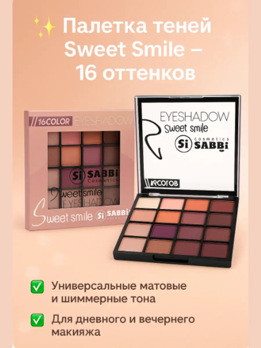 Если вы ищете тени для век 16 цветов, палетку теней с шиммером, палетку для макияжа глаз универсальную, или хотите пополнить свою косметичку стильным и практичным набором, то Sweet Smile SABBI станет вашим идеальным выбором.