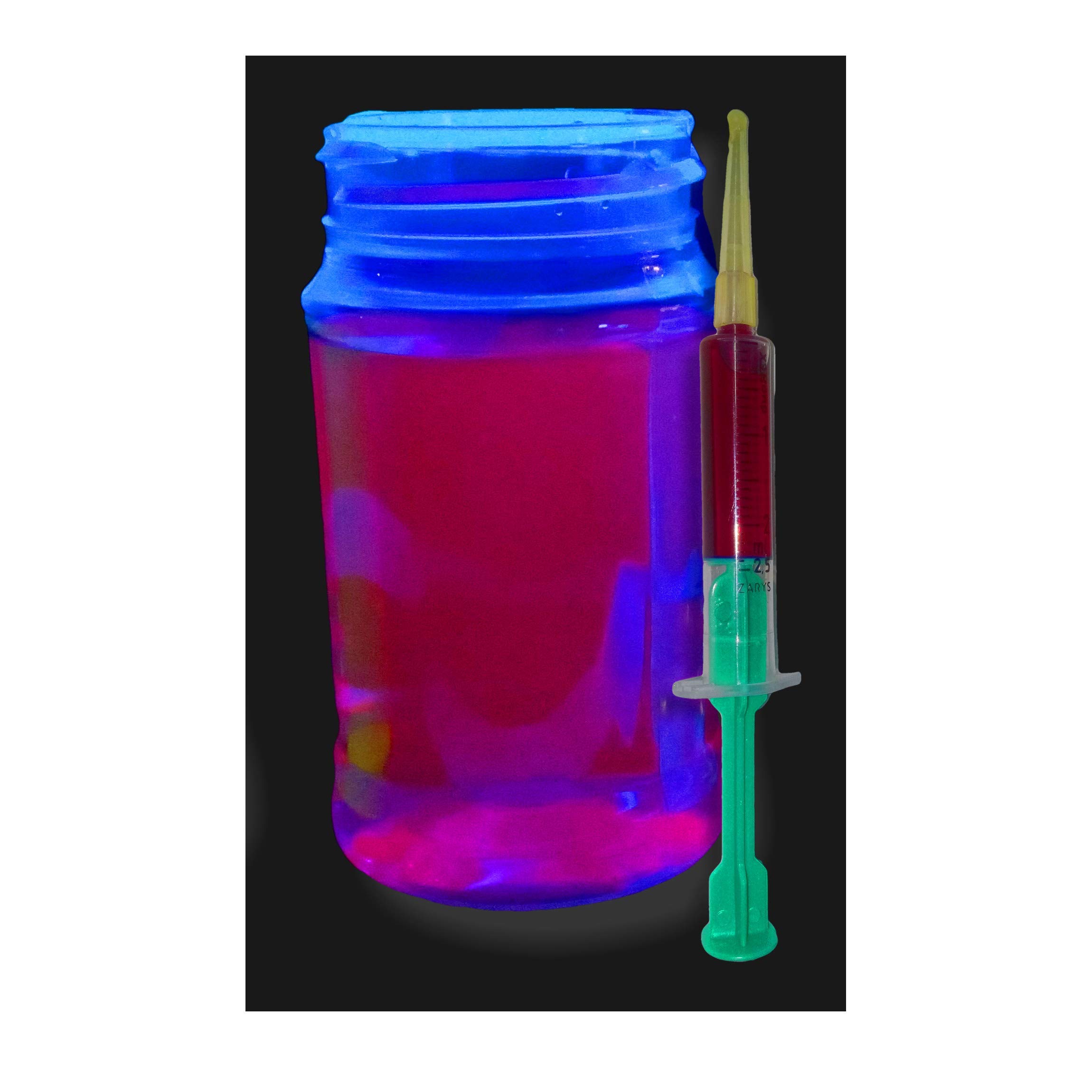 Incandescent Fluorescent Dye, Liquid: Neon UV Blacklight Reagent 2ml Concentrate - Pink (Red) UV Pink (Red), 2ml - Shipped in a 2ml syringe for easy use - Add drops to water - 2ml of concentrated ultraviolet dye - enough to make over 1 liter of UV reactive liquid. - Non-toxic - Add to water to make colored water that glows under UV light - Glows a bright fluorescent color in the dark under ultraviolet black light