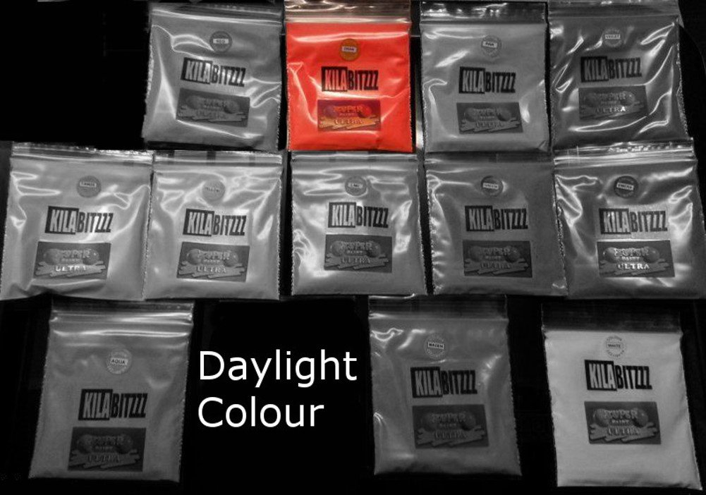 - Available in many colors. We invented and manufacture this pigment. - - - 20g of the same color - Color of your choice. Ultra-pigmented fluorescent powder. Works best when mixed with clear resin. The pigment powder has a brilliant color in daylight. Glows the same color when viewed under ultraviolet black light. Once charged with light, it glows in the dark (see photos for color in the dark). The more light it is charged with, the more intense the fluorescence will be. Very fine granulation, ideal for mixing with resins, varnishes, and other liquids. Ideal for airbrushing, jewelry making, and creating beautiful artwork. Glows when violet light is on and in the dark when the light is off. Glows best with violet light bulbs that have a wavelength of 365 nm - Also glows at higher ultraviolet wavelengths and with ultraviolet LEDs. Non-toxic, non-radioactive. Optimal lifespan. See photos for how colors appear under different lighting conditions (daylight, darkness, ultraviolet light).Non-toxic, non-radioactive. Premium quality powder to be mixed with clear resin and other liquids (not water). 20-page information leaflet included. Fluorescent neon color, glows under UV light. Glows in the dark once charged with light.Poudre pigmentée ultra fluorescente - Pour les étagères luminescentes ou les bijoux en résine, Orange, 20 gDESCRIPTION DU PRODUIT - Disponible en de nombreuses couleurs. Nous avons inventé et fabriquons ce pigment. - - - 20 g de la même couleur - Couleur au choix. Poudre fluorescente ultra pigmentée. Fonctionne très bien lorsqu'elle est mélangée avec de la résine transparente. La poudre pigmentée a une couleur éclatante à la lumière du jour. Brille de la même couleur lorsqu'on la regarde dans la lumière noire ultraviolette. Une fois chargée de lumière, elle brille dans l'obscurité (voir les photos pour la couleur dans le noir). Plus elle est chargée de lumière, plus la fluorescence sera intense. Granulation très fine, idéale pour le mélange avec les résines, vernis et autres liquides. Idéal pour un usage aérographe, fabrication de bijoux et de belles œuvres d'art. Brille lorsque la lumière violette est allumée et dans l'obscurité lorsque la lumière est éteinte. Brille mieux avec des ampoules à lumière violette qui ont une longueur d'onde de 365 nm - Brille également à des longueurs d'onde ultraviolettes plus élevées et avec des LED ultraviolettes. Non toxique, non radioactive. Durée de vie optimale. Voir les photos pour la façon dont les couleurs apparaissent sous chaque lumière (lumière du jour, obscurité, lumière ultraviolette).Non toxique, non radioactive. Poudre de qualité supérieure à mélanger avec de la résine claire et d'autres liquides (pas d'eau). Brochure d'information de 20 pages inclue. Couleur de néon fluorescent, luisant aux rayons UV. S'allume dans l'obscurité une fois chargée de lumière.
