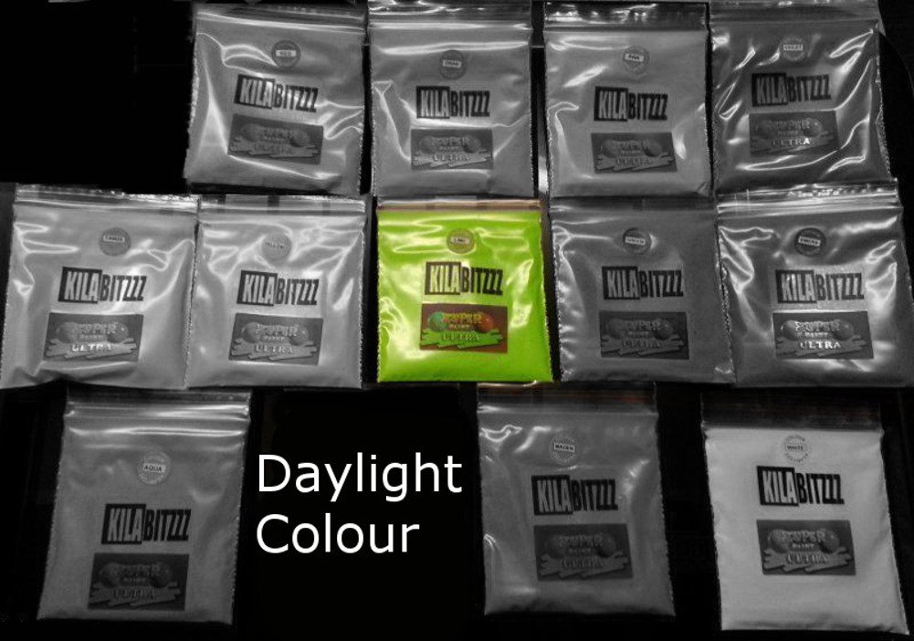 This is a sachet of Ultra Pigment 5 Fluorescent Powder - Choose your color from the available selection. The pigment powder has a strong color in daylight. Then, it glows the same color when viewed under ultraviolet black light (the purple lights found in bars, nightclubs, light shows, and fairs). Once charged with light, it glows in the dark (see photos for the glow-in-the-dark color). It works perfectly when mixed with clear resin. The better the charging light, the higher the glow intensity. The very fine particle size is ideal for mixing with resins, varnishes, and other liquids. Ideal for airbrushing, jewelry making, and artwork. Glows when black light is on and glows in the dark when the light is off. Glows best with black light bulbs that have a wavelength of 365 nm, but will still glow at higher ultraviolet wavelengths and with UV LEDs. Non-toxic, non-radioactive. Can be recharged repeatedly almost indefinitely and will continue to work for over 10 years. See the photos to see how the colors appear under each type of light (glow-in-the-dark, daylight, UV black light). If you want to create your own light-up shelf like the beautiful ones made by Matt Brown, this is the authentic product he used. It is shown here in turquoise blue, but we also have many other colors available. We invented and manufactured this pigment and are the only suppliers of genuine Ultra Powder. No one else has the same or better than us. Don't be confused by other sellers of standard phosphorescent water powder. This is the wrong product it doesn't have the correct color in daylight and doesn't have the right strong color under fluorescent lighting.Non-toxic. Non-radioactive. High-quality powder to mix with clear resin and other liquids (not water). Comes with our exclusive information booklet so you can get the most out of our product. Bright fluorescent color under UV black light. Glows in the dark once charged with light.Poudre de pigment UV fluorescente ultra phosphorescente pour étagère ou bijoux en résine Vert citron 50 gDESCRIPTION DU PRODUIT Il s'agit d'un sachet de poudre fluo fluo fluo 5 Ultra Pigment - Choisissez votre couleur parmi la sélection disponible. La poudre pigmentée a une couleur forte à la lumière du jour. Ensuite, brille de la même couleur lorsqu'elle est vue sous la lumière noire ultraviolette (les lumières violettes qui se trouvent dans les bars, les boîtes de nuit, les fêtes lumineuses et les foirs). Une fois chargé avec la lumière, il brille dans le noir (voir photos pour la couleur qui brille dans le noir). Cela fonctionne parfaitement lorsqu'il est mélangé avec de la résine transparente. Plus la lumière de charge est bonne, plus l'intensité de la lueur est élevée. Une taille de particules très fine, idéale pour mélanger avec des résines, des vernis et d'autres liquides. Idéal pour l'aérographe, la fabrication de bijoux et les œuvres d'art. Brille lorsque la lumière noire est allumée et brille dans le noir lorsque la lumière est éteinte. Brille mieux avec des ampoules à lumière noire qui ont une longueur d'onde de 365 nm, mais qui auront toujours une lueur à des longueurs d'onde ultraviolettes plus élevées et avec des LED UV. Non toxique, non radioactif. Peut être chargé maintes et maintes fois presque indéfiniment et continuera à fonctionner pendant plus de 10 ans. Voir les photos pour voir comment les couleurs apparaissent sous chaque forme de lumière (brille dans le noir, lumière du jour, lumière noire UV). Si vous voulez créer votre propre étagère lumineuse comme les belles fabriquées par Matt Brown, c'est le produit authentique utilisé par lui. Il est en bleu turquoise, mais nous avons également disponible beaucoup d'autres couleurs. Nous avons inventé et fabriqué ce pigment et sommes les seuls fournisseurs de la véritable poudre Ultra. Personne n'a la même ou mieux que nous. Ne soyez pas confondu par d'autres vendeurs de poudre d'eau phosphorescente standard. C'est le mauvais produit, il n'a pas la couleur à la lumière du jour et n'a pas la bonne couleur forte dans l'éclairage fluorescent.Non toxique. Non radioactif. Poudre de haute qualité à mélanger avec de la résine transparente et d'autres liquides (pas de l'eau). Fourni avec notre livret d'information exclusif pour que vous puissiez tirer le meilleur parti de notre produit. Couleur fluo brillante sous la lumière noire UV. Brille dans le noir une fois chargé de lumière.