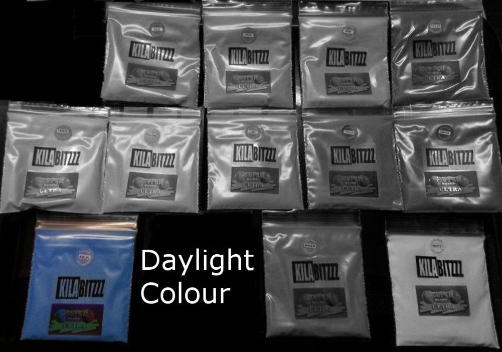 This is a 50g bag of ultra-pigmented fluorescent powder that glows in the dark. Choose your color from the available selection. The pigmented powder has a strong color in daylight. Then it glows the same color when viewed under ultraviolet black light (the purple lights found in bars, nightclubs, parties, and fairs). Once charged with light, it glows in the dark (see photos for the color each glows in). It works very well when mixed with clear resin. The higher the charging light, the better the glow intensity. The very fine particle size is ideal for mixing with resins, varnishes, and other liquids. Ideal for airbrushing, jewelry making, and artwork. Glows when black light is on and glows in the dark when the light is off. It glows best with black light bulbs that have a wavelength of 365 nm, but it will still glow at higher ultraviolet wavelengths and with UV LEDs. It is non-toxic and non-radioactive. It can be recharged repeatedly almost indefinitely and will last for over 10 years. See the photos to see how the colors appear under each type of light (phosphorescent, daylight, UV black light). If you want to create your own light-up shelves like the most beautiful ones made by Matt Brown, this is the authentic product he used. It is shown here in aqua blue, but we also have many other colors available. We invented and manufactured this pigment and are the only suppliers of genuine Ultra Powder. No one else has the same or better than us. Don't be fooled by other sellers who offer just standard phosphorescent water powder. This is the wrong product it does not have the color of daylight and does not have the correct strong glow color in fluorescent lighting.Non-toxic. Non-radioactive. High-quality powder to mix with clear resin and other liquids (not water). Comes with our exclusive information booklet so you can get the most out of our product. Fluorescent and luminous colors under UV black light. Glows in the dark once charged with light.Poudre pigmentée UV fluorescente ultra brillante - 50 g - utilisée pour les étagères ou bijoux en résine (bleu aqua)DESCRIPTION DU PRODUIT Il s'agit d'un sac de 50 g de poudre ultra pigmentée fluorescente fluorescente qui brille dans le noir. Choisissez votre couleur dans la sélection disponible. La poudre pigmentée a une couleur forte en plein jour. Puis il brille de la même couleur lorsqu'il est vu à la lumière noire ultraviolette (les lumières violettes que l'on trouve dans les bars, les boîtes de nuit, les fêtes et les foires). Une fois chargé avec la lumière, il brille dans le noir (voir photos pour la couleur que chacune brille dans le noir). Cela fonctionne très bien lorsqu'il est mélangé avec de la résine transparente. Plus la lumière de charge est élevée, plus l'intensité lumineuse est meilleure. Une taille de particules très fine, idéale pour mélanger avec des résines, vernis et autres liquides. Idéal pour une utilisation à l'aérographe, la fabrication de bijoux et les œuvres d'art. Brille lorsque la lumière noire est allumée, et brille dans le noir lorsque la lumière est éteinte. Brille mieux avec les ampoules à lumière noire qui ont une longueur d'onde de 365 nm, mais qui auront toujours une lueur à des longueurs d'onde ultraviolettes plus élevées et avec des LED UV. Il est non toxique, non radioactif. Peut être rechargé maintes et maintes fois presque indéfiniment et il fonctionnera pendant plus de 10 ans. Voir les photos pour voir comment les couleurs apparaissent sous chaque forme de lumière (phosphorescente, lumière du jour, lumière noire UV). Si vous voulez créer votre propre étagère lumineuse comme les plus belles fabriquées par Matt Brown, c'est le produit authentique utilisé par lui. Il est en bleu aqua mais nous avons également disponible de nombreuses autres couleurs. Nous avons inventé et fabriqué ce pigment et sommes les seuls fournisseurs de la véritable poudre Ultra. Personne n'a le même ou meilleur que nous. Ne vous laissez pas confondre par d'autres vendeurs, juste une poudre d'eau phosphorescente standard. C'est le mauvais produit, il n'a pas la couleur de la lumière du jour et ne possède pas la bonne couleur de lueur forte dans un éclairage fluorescent.Non toxique. Non radioactif. Poudre de haute qualité à mélanger avec de la résine transparente et d'autres liquides (pas d'eau). Fourni avec notre livret d'information exclusif afin que vous puissiez tirer le meilleur parti de notre produit. Couleurs fluorescentes et lumineuses à la lumière noire UV. Brille dans le noir une fois chargée avec la lumière.