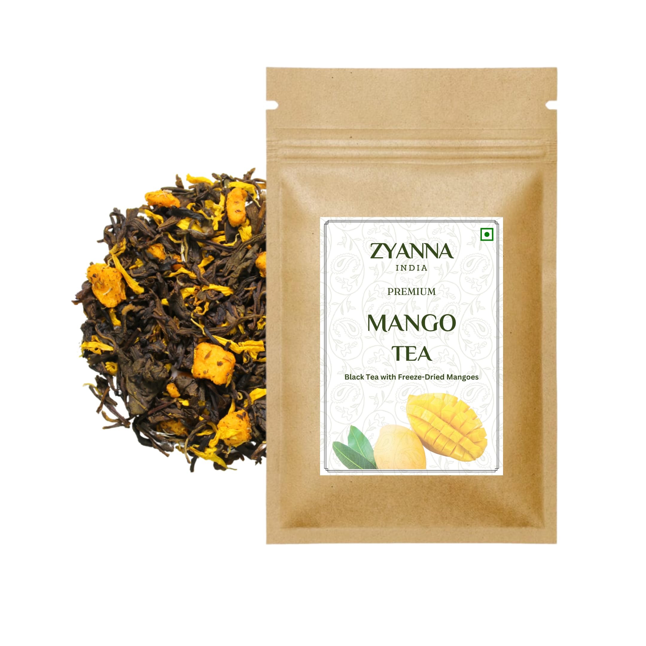 Low Caffeine Content: This is a low caffeine tea, making it a perfect choice for those seeking a green drink without the excessive stimulation of regular teas. Enjoy your mango green tea. Whole Leaf Loose Tea: This premium Mango Green Tea is a loose leaf tea, allowing you to adjust the strength to your taste. Brewing this tea loose leaf ensures maximum flavor extraction from the tea. Natural Ingredients & Eco-Friendly Packing: Our mango tea is made with dried mango and natural ingredients, ensuring a fresh flavored drink. Packaged in eco-friendly materials. Versatile Tea Preparation: Our Mango Green Tea is perfect for both hot tea and iced tea preparations. The sweet tea flavor of mango blends well with the refreshing taste of green tea. Premium Mango Green Tea: Experience the finest Indian green drink with our premium Mango Green Tea. This loose tea merges the lushness of ripe mangoes with the richness of whole leaf green tea.