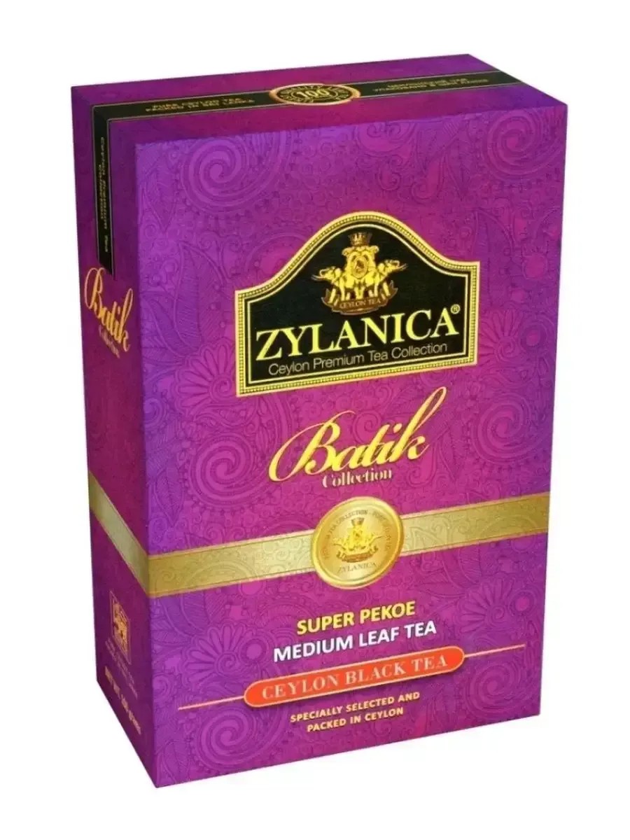 Zylanica Чай Batik Design Super Pekoe черный, 100 г. Это черный цейлонский крупнолистовой чай сорта Pekoe. При заваривании получается чайный напиток с насыщенным вкусом и ароматом. 100% экологически чистый листовой чай, собранный на лучших чайных плантациях.Способ приготовления:Заварить крутым кипятком чайные листья из расчета 1 чайная ложка на 1 порцию напитка. Выдержать 2-3 минуты. Желательно использовать фильтрованную воду.Хранить в прохладном сухом месте без посторонних запахов при относительной влажности воздуха не более 70%. Не подвергать воздействию прямого солнечного света.