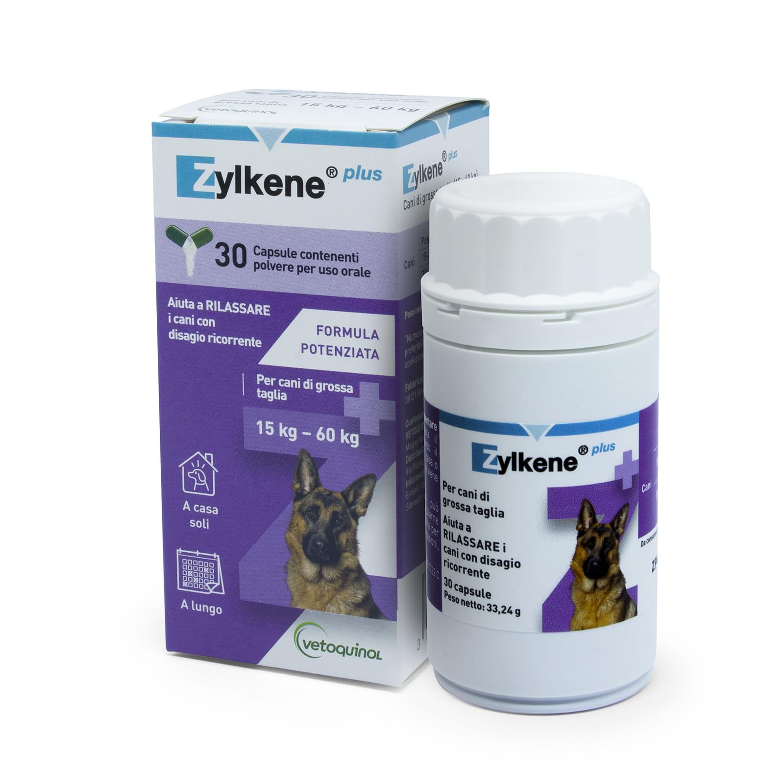 Zylkene Plus Complementary feed Dogs over 15 kg Relaxing for situations of recurring discomfort 30 capsules of 450 mg DIRECTIONS FOR USE For dogs weighing between 15 kg and 30 kg, it is recommended to use 1 capsule per day, while for those that reach up to 60 kg if we recommend 2. Always leave water available to the animal.Brand: CentroVete. Product Type: PET SUPPLIES. CentroVete Zylkene Plus Large Dogs 15-60kg, 30 CPS, Helps relax dogs suffering from recurring discomfort. Zylkene Plus Aliment complémentaire Chiens de plus de 15 kg Relaxant pour les situations d'inconfort récurrent 30 gélules de 450 mg MODE D'EMPLOI Pour les chiens pesant entre 15 kg et 30 kg, il est recommandé d'utiliser 1 capsule par jour, tandis que pour ceux qui atteignent jusqu'à 60 kg si nous en recommandons 2. Laissez toujours l'eau à disposition de l'animal.Marque: CentroVete. Type de produit: PET SUPPLIES. CentroVete Zylkene Plus Chiens de Gros Taille 15-60kg,30 CPS, Aide à détendre les chiens souffrant d'inconfort récurrent.